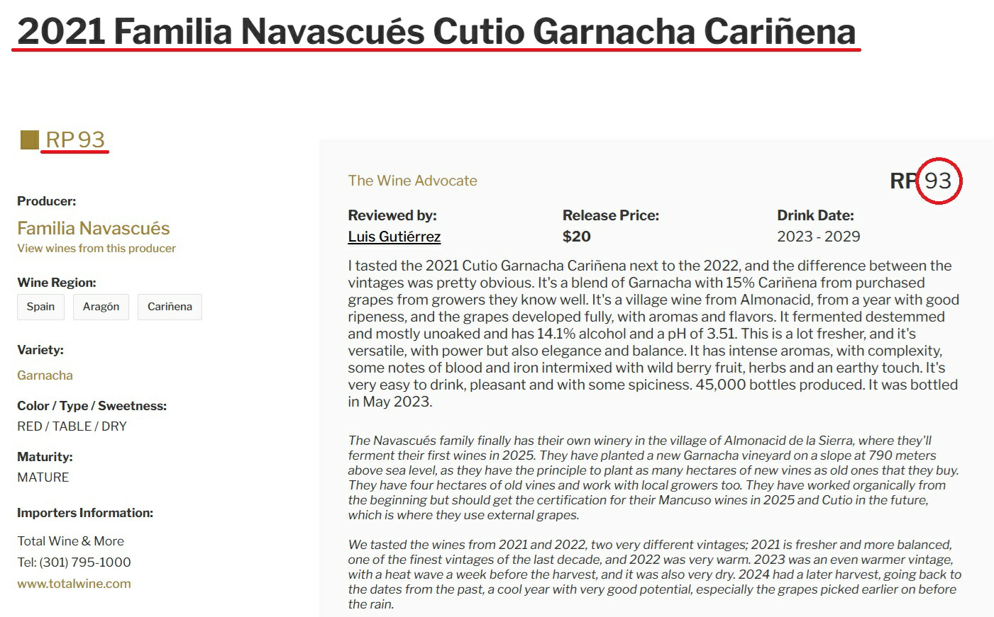 なんとこの2021年ヴィンテージがロバート・パーカー氏主宰ワインアドヴォケイトにおいて【93点】もの高得点を獲得!!