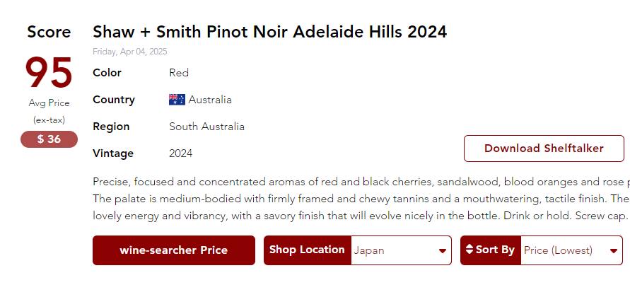 商品名:ショー・アンド・スミス・ピノ・ノワール2024 オーストラリア Australia 赤ワイン wine 750ml 辛口 Shaw+Smith James Suckling 95点