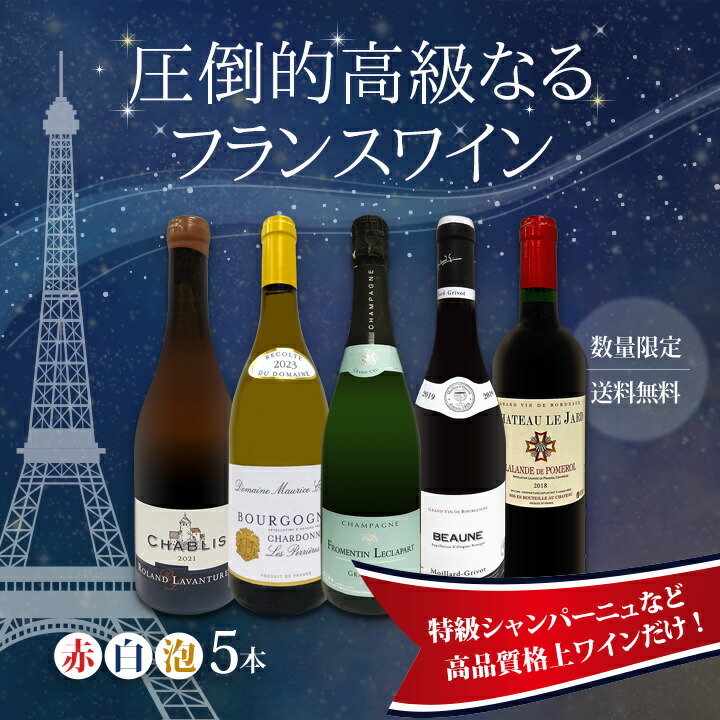 - 数量限定特売セット!圧倒的フランス高級ワインばかりを5本セットにしてスペシャル価格で極少量特売!特級シャンパーニュや激旨ブルゴーニュなど、高品質格上ワインだけ!どれも桁外れの上質なるフランスワインばかり!まさに高級ワインが手頃に買える限定セットです!絶対にお見逃しなく! 商品名: 特級シャンパーニュも入ってる 圧倒的高級なるフランス France 限定5本セット set