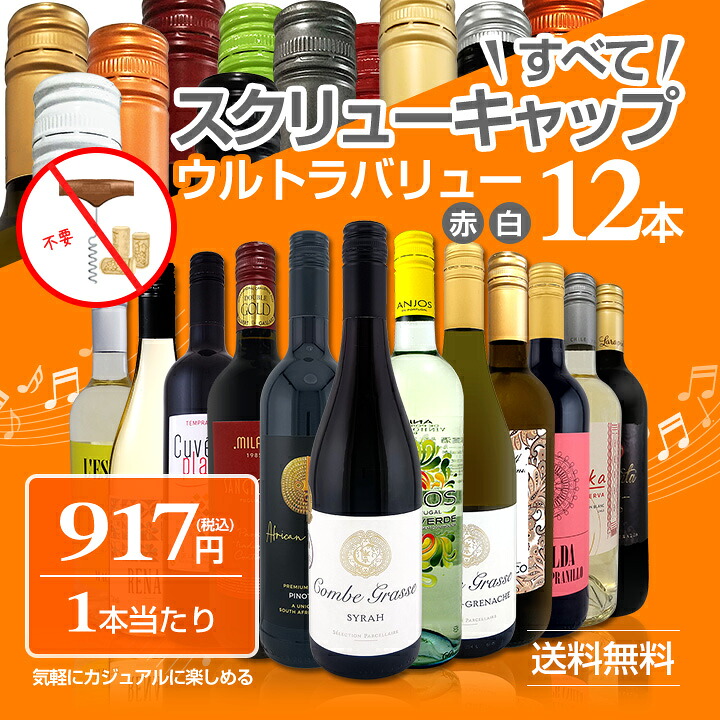 - ≪赤・白ミックス12本すべてスクリューキャップです!!≫『もっともっと気軽にカジュアルにワインを楽しみたい!!』そんなたくさんのお声にお応えして、たっぷりワインを楽しめる大満足ワイン12本セットをご用意させていただきました!まさにウルトラバリューです!!ぜひともたっぷりとワインを楽しんで下さい! 商品名: すべてスクリュー・キャップ 1本あたり917円 税込 赤・白ミックス ウルトラバリュー12本セット set