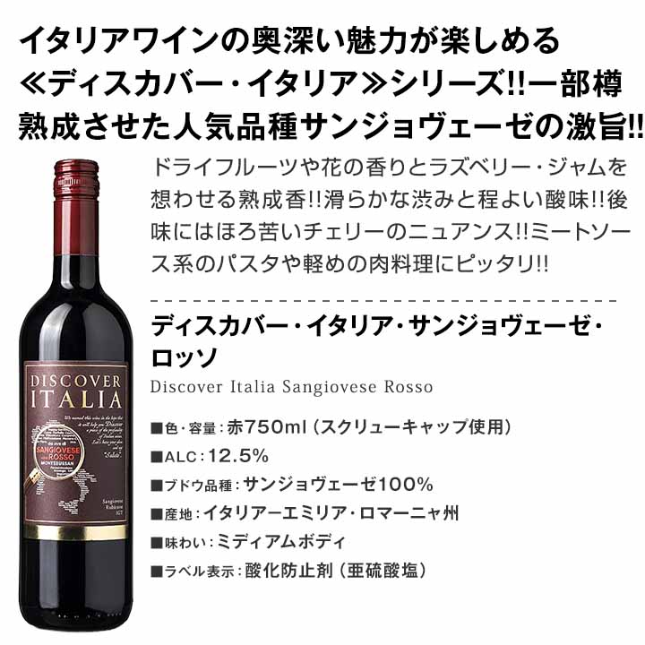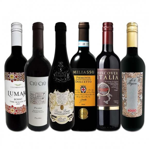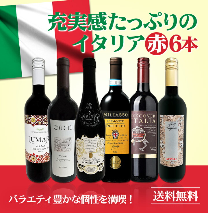 - イタリア最強レベルのコスパ[ボッター]の濃厚アパッシメントに、ピエモンテの家庭の食卓の定番★激旨ドルチェット!!そして!!大人気[チウ・チウ]が放つベストコスパ[ピッキオ]に、エミリア・ロマーニャの激旨サンジョヴェーゼ!!さらに!!シチリア最大級の生産者が放つコスパ抜群の激旨に、ロンバルディア州に拠点を置く優良生産者が放つ激旨!! 人気のイタリアから、激旨赤ワイン6本をセレクトいたしました!!バラエティ豊かなイタリアワインの個性をご満喫ください!! 商品名:バラエティ豊かな個性を満喫 激旨イタリア Italy 赤ワイン wine 6本セット set