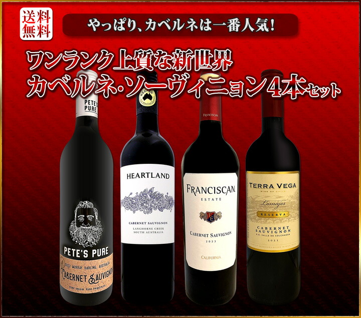 やっぱり、カベルネは一番人気!濃厚な果実味が堪能でき、エレガンスも感じられるカベルネを中心に、新世界カベルネの醍醐味を味わえる新世界カベルネ4本セット!5年ぶりに日本市場に登場したカリフォルニア・カベルネを中心に、当店独占販売の豪州カリスマのカベルネ、SNSでも大人気のカベルネなど、ワンランク上質なカベルネを4本厳選しました!飲み比べにも最適です!