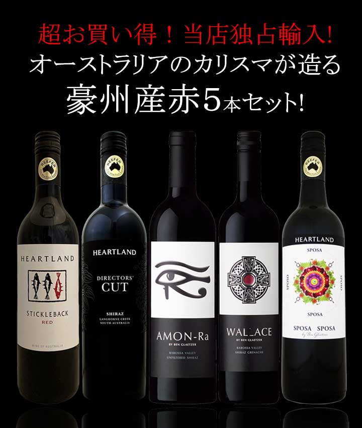 - オーストラリアのカリスマ!ベン・グレッツァー氏が造るワインセット!最高峰アモンラを含む厳選5本!ネットでは当店でしか買えないグレッツアー&当店独占輸入のハートランド!うち3本はシラーズ100%もしくはシラーズベースのブレンド!微妙に違うシラーズの飲み比べも楽しみのひとつ!品種違い、ブレンドの妙、天才ベン・グレッツァー氏のすごさを実感していただけるセットです! 商品名: 超お買い得 当店独占輸入 オーストラリア Australia のカリスマが造る豪州産赤5本セット set