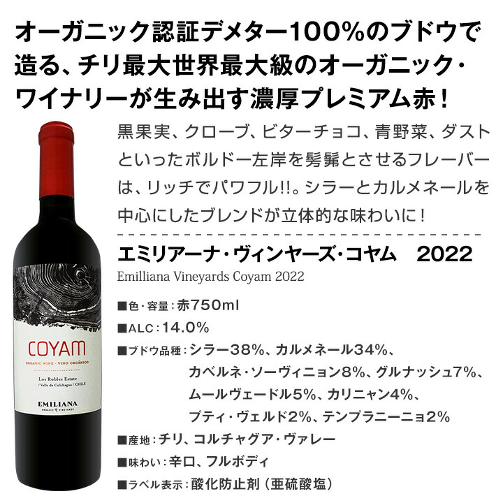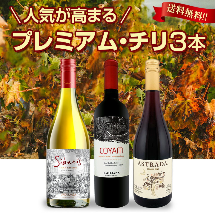 - 今、人気が高まるプレミアム・チリ!チリワインといえば、安くて美味しい!というイメージが定着していますが、実は中価格帯のコスパは低価格帯以上!チリ最大級のワイナリーが造る濃厚なプレミアムワインをメインに、当店直輸入のオーガニック・ピノ・ノワールとグラン・レゼルヴァ・クラスのシャルドネ!コスパを十二分に味わえるワンランク上質なワイン3本をセットにしました! 商品名: 今、注目を集めるプレミアム・チリ3本セット set コスパのよさはダントツ