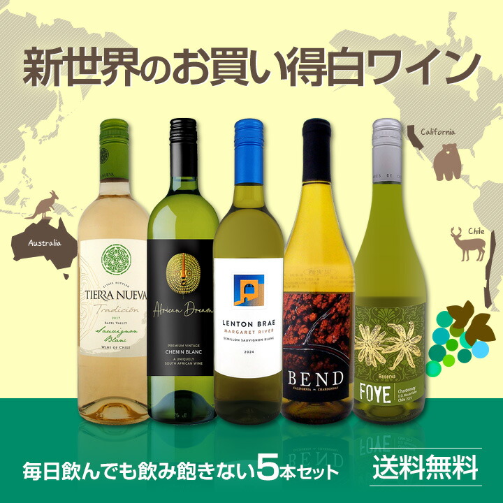 - 大人気!新世界の厳選白5本セット!新世界のお買い得白ワインをバラエティ豊かにお届けします!単一品種だけでなく、ブレンドによるワインも充実!!ブレンドによって味わいが立体的になるのがミソ!初登場の豪州はマーガレット・リヴァー産の白は、故エリザベス女王も飲んだワイン!毎日飲んでも楽しい、飲み飽きない充実のセットとなりました! 商品名: 初登場の当店独自輸入の白をメインに、新世界のお買い得白ワイン wine 5本セット set