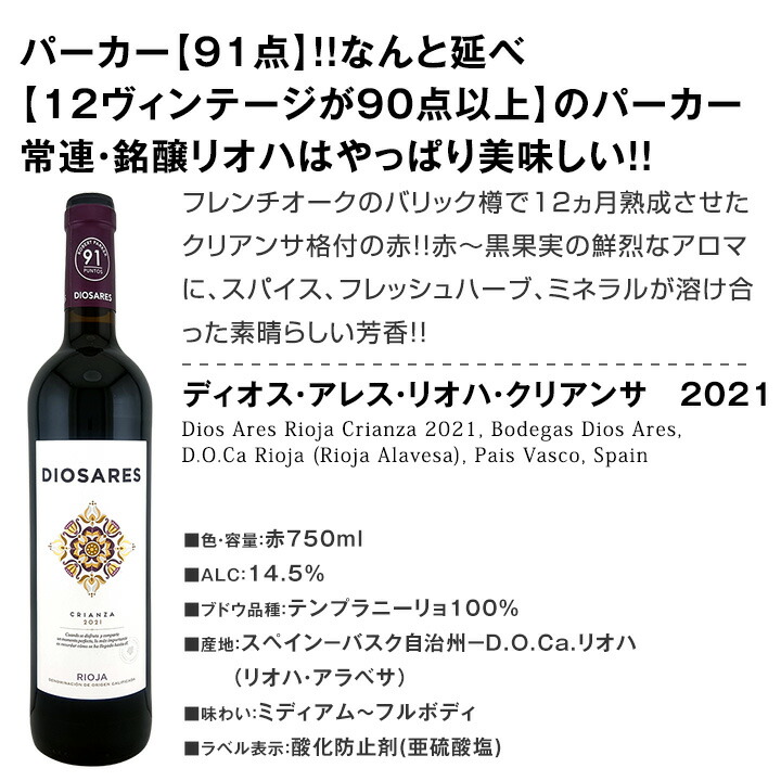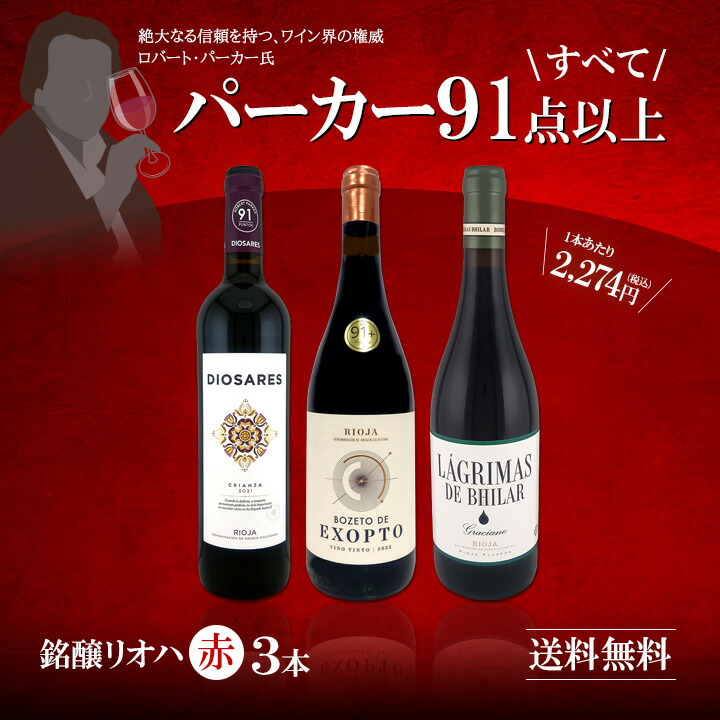 - 大人気パーカーセットから銘醸リオハだけ厳選!!しかも3本すべて【91点】獲得の格上・上級リオハのみ!!すべて【パーカー91点以上】の高評価ワイン!しかもワイン大国スペインで最も伝統的な銘醸地にして品質を厳格に管理するカテゴリ[特選原産地呼称DOCa]リオハの赤ワインのみ!絶大なる信頼を持つ、ワイン界の権威ロバート・パーカー氏主宰のワイン・アドヴォケイトにおいて、すべて91点以上を獲得した間違い無しのリオハ赤ワインだけ!!とってもお買い得!この機会を是非ともお見逃しなく! 商品名: ぜんぶパーカー parker 91点以上 しかも銘醸リオハだけ 厳選極旨赤ワイン wine 3本セット set