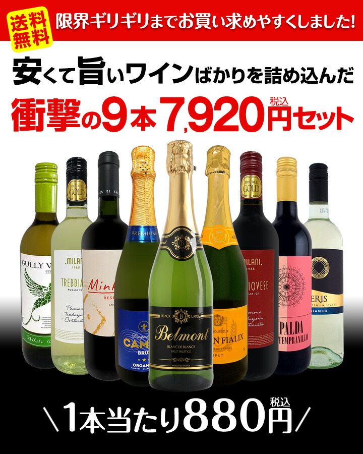 商品名: 第62弾 当店最安級 1本あたり880円 税込 限界ギリギリまでお買い求めやすくしました 安くて旨いワイン wine ばかりを詰め込んだ衝撃の9本7,920円 税込 セット