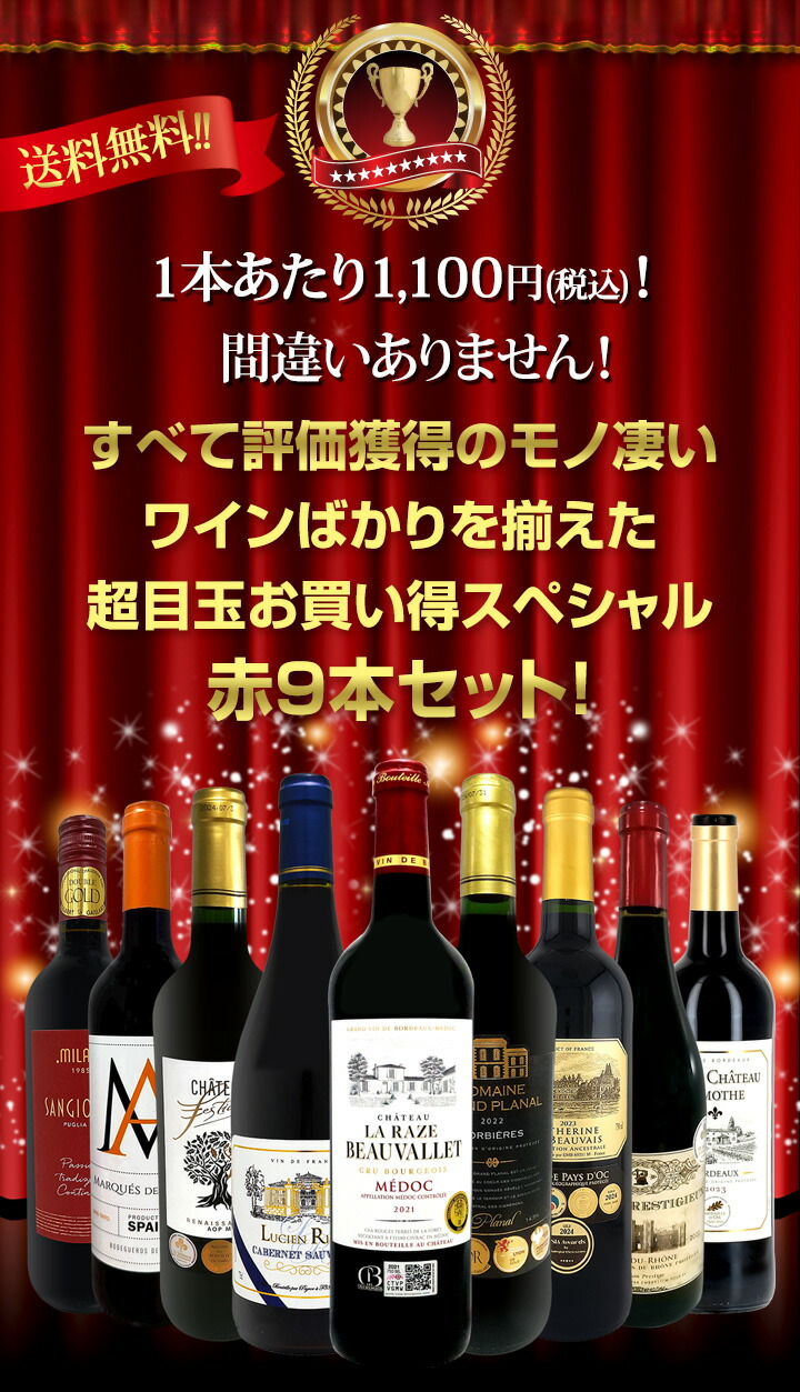 間違いありません!絶対に見逃さないで下さい!!すべて≪高評価≫を獲得した赤ワインばかりを集めた間違いなしの超スペシャル赤9本セット!【チャレンジインターナショナル金賞】クリュ・ブルジョワの王道メドックに、≪驚愕の四冠金賞!!≫濃密でリッチな南仏極旨コルビエール!!そして!!≪圧巻の5冠金賞!!≫コンクール荒らしの南仏激旨に、≪納得のダブル金賞!!≫ジューシーかつ飲み応えたっぷりの南仏ミネルヴォワ!!さらに!!スペイン固有の高貴品種テンプラニーリョ100%の激旨に、南イタリア屈指の人気産地プーリアの激旨サンジョヴェーゼなどなど!!とにかく評価目白押しのワインばかりを厳選した超目玉お買い得セットです!当店が自信をもってお届けします!在庫に限りがございますので、是非ともお早めにお買い求め下さい!!