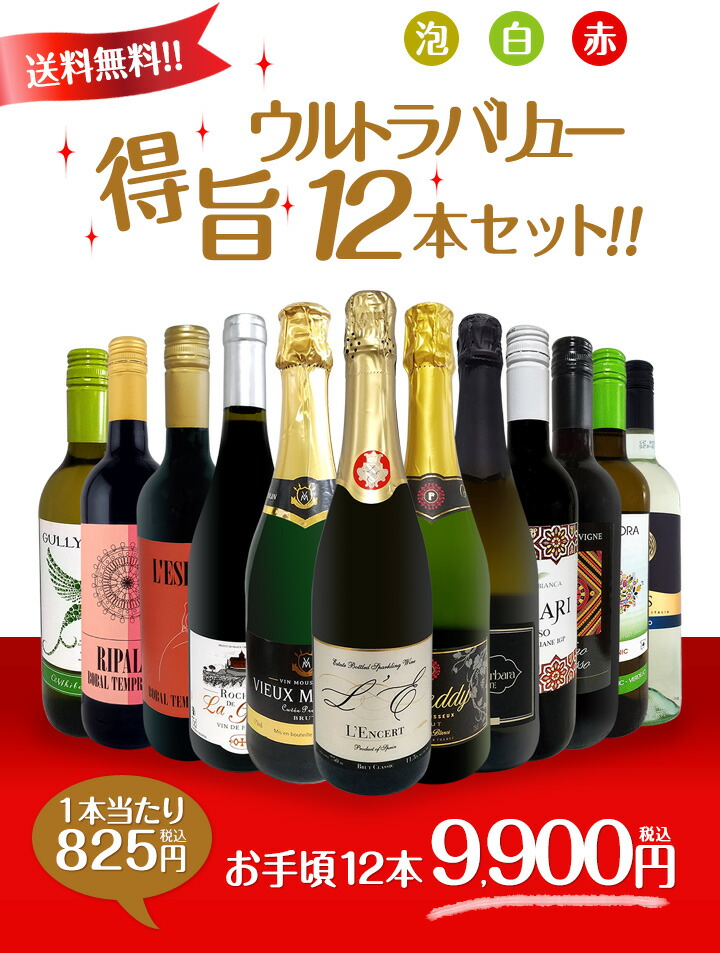 - たっぷりワインを 楽しめる大満足ワイン12本セットご用意させていただきました!! ぜひともたっぷりとワインを楽しんで下さい! 商品名: 第201弾 1本あたり825円 税込 泡、赤、白 得旨ウルトラバリュー12本9,900円 税込 セット set