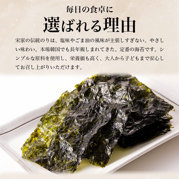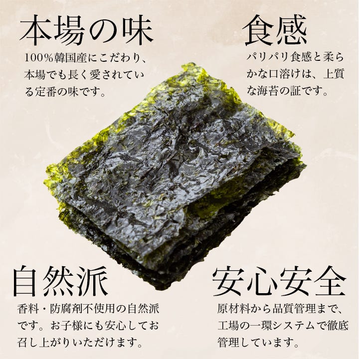 - 乾海苔(岩海苔+青のり)を使用。大豆油、ごま油、えごま油で丁寧に香ばしく焼き上げました。本場韓国人が納得の美味しさに、リピート率も高い商品です。パリッとした歯応え、とろけるやわらかさは、上質な海苔の証です。海の牛肉とも呼ばれる海苔は、ミネラル、タンパク質、食物繊維など、栄養素が多く含まれており、ヘルシーな上に、おつまみや料理にも使いやすく、飲食店はもちろんご家庭でも大人気です!