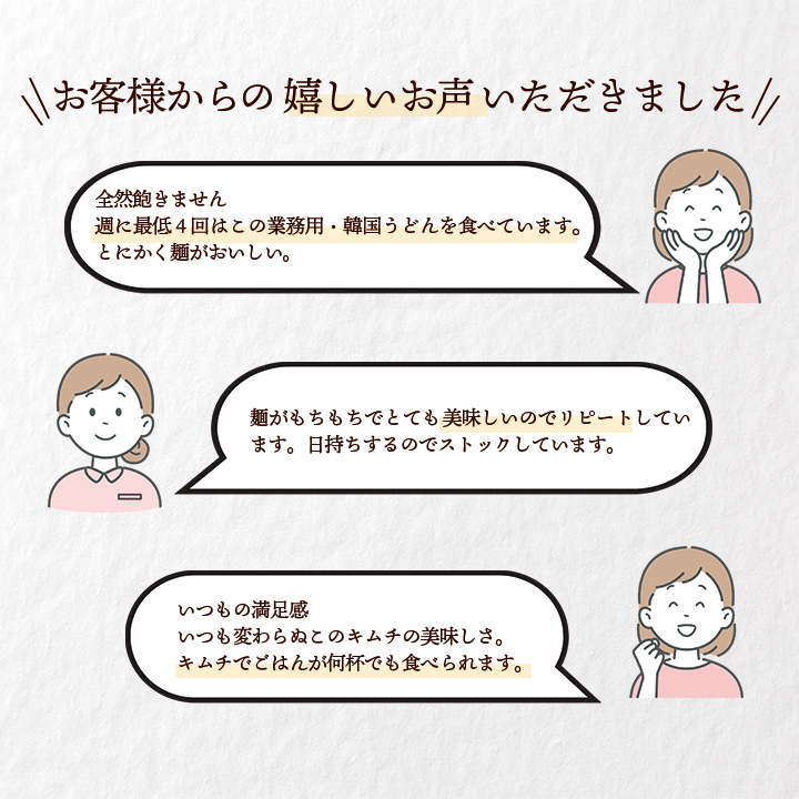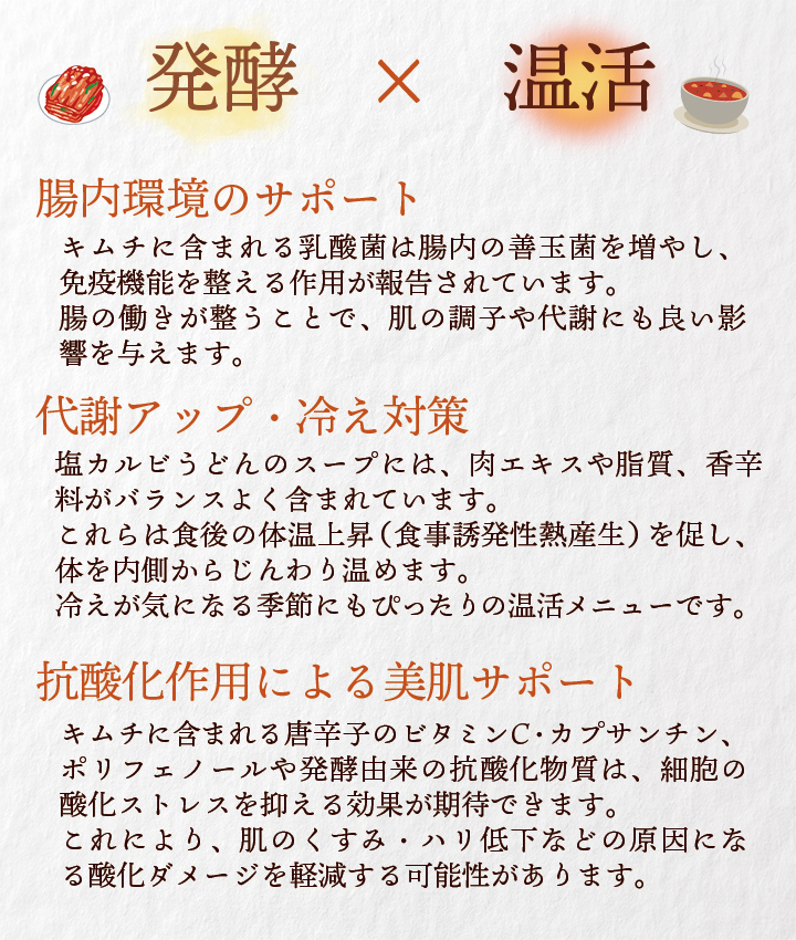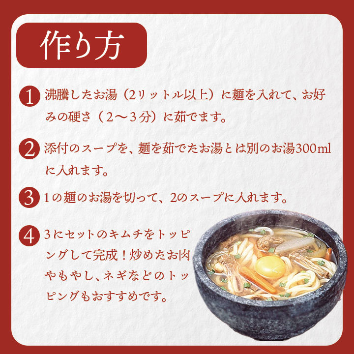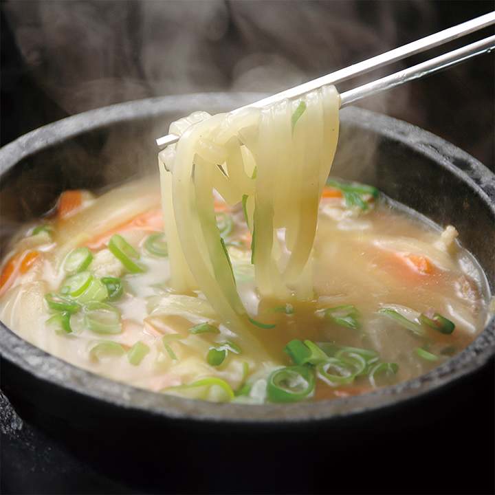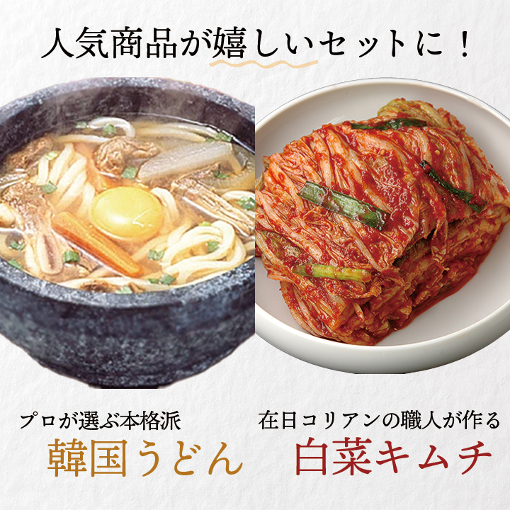 当店オリジナル開発品の塩カルビスープに、杵打ち風の太いうどんをセットにしています。煮込んでもコシのあるうどんは、スープの味をしっかりと染み込ませてお楽しみ下さい。白菜キムチと一緒で、より一層美味しく召し上がれます。
