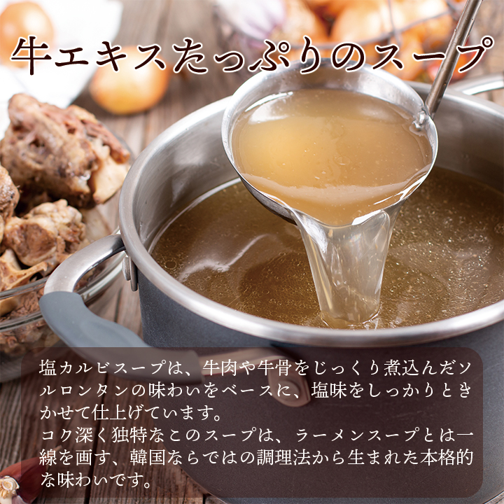 (塩カルビスープ):肉エキス(国内製造)、食塩、動物油脂、砂糖混合異性化液糖、たん白加水分解物、しょうゆ、香辛料、ショートニング / 調味料(アミノ酸等)、酒精、増粘剤(加工デンプン、キサンタン)、カラメル色素、香料、カロチン色素、(一部に小麦・大豆・豚肉を含む)