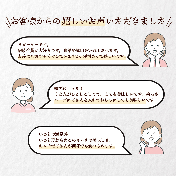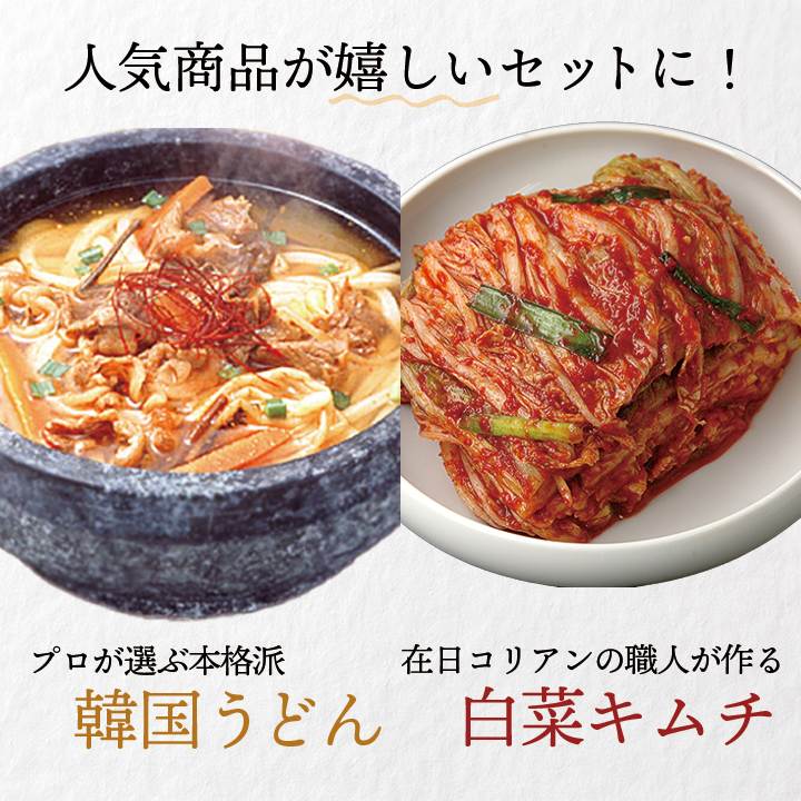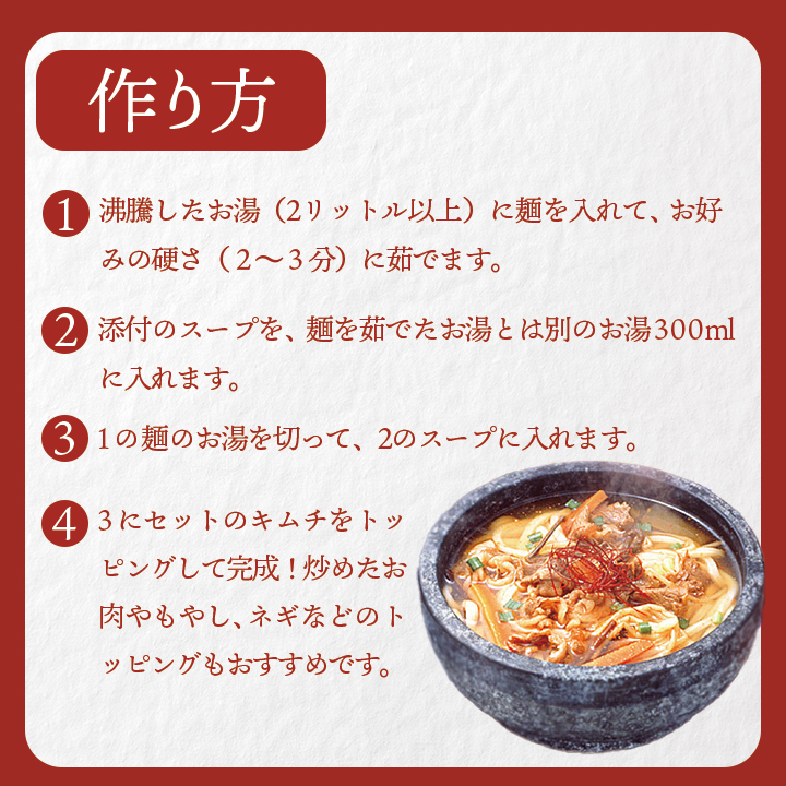 当店オリジナル開発品の韓国風ユッケジャン味のスープに、杵打ち風のコシのしっかりしたうどん麺、トッピングの白菜キムチをセットにしています。ラーメンでも冷麺でもない、韓国のあったかい麺料理をぜひ味わってみてください。