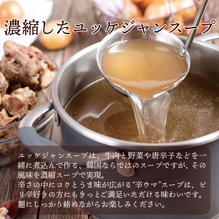 (ユッケジャンスープ):しょうゆ(国内製造)、肉エキス、食塩、砂糖、ガーリック、動物油脂、ごま、植物油脂、豆板醤、ショートニング、唐辛子、酵母エキス / 調味料(アミノ酸等)、増粘剤(加工デンプン、キサンタン)、酒精、カラメル色素、パプリカ色素、香辛料抽出物、酸味料、香料、カロチン色素、(一部に小麦・ごま・大豆・鶏肉・豚肉を含む)