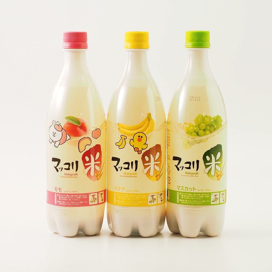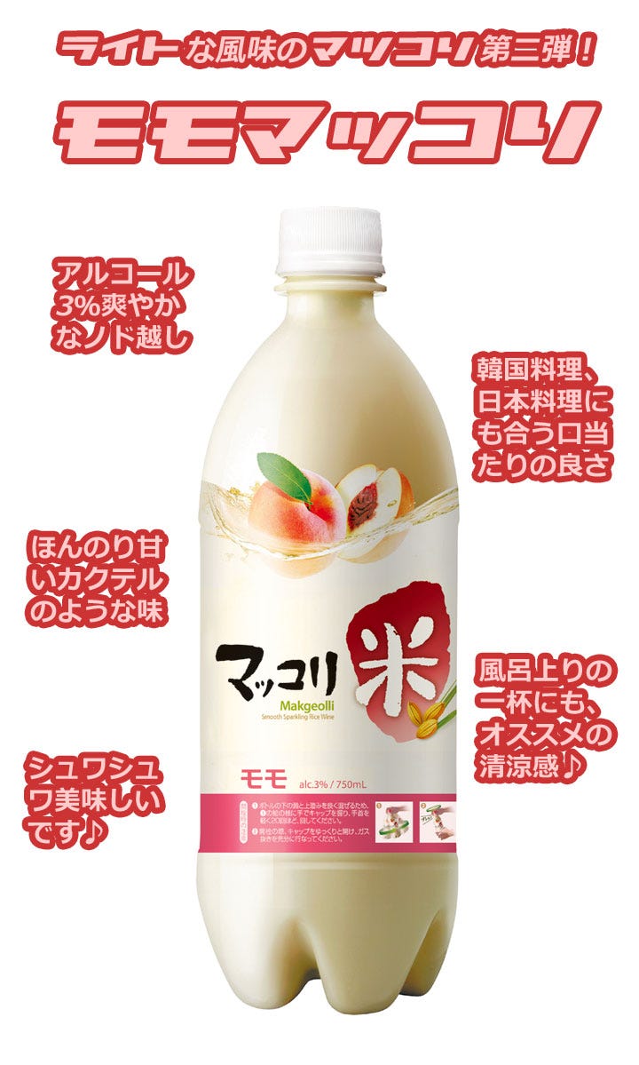 ●モモマッコリ:米、酵母、麹 / 果糖、二酸化炭素、クエン酸、モモ香料、モモ濃縮液、乳酸、甘味料(アスパルテーム・L-フェニルアラニン化合物)