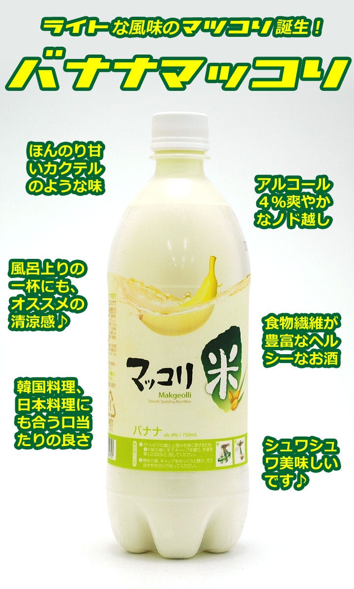 ●バナナマッコリ:米、果糖、砂糖、麹、二酸化炭素、酵母、クエン酸、バナナピューレ、バナナ香料、乳酸、 甘味料(アスパルテーム・Lフェニルアラニン化合物)
