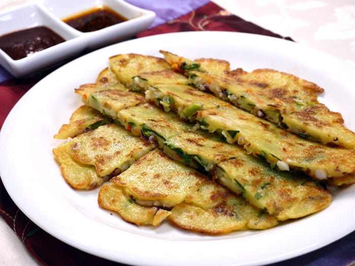 小麦粉と卵をベースにした生地に、ニラや玉ねぎなどの野菜と、イカ等の海鮮類を具材にして焼いた料理。まわりはカリッと、中はフワフワした食感が人気の韓国料理です。