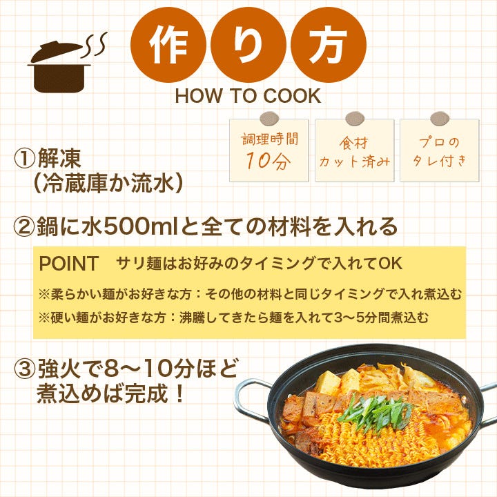 豆腐(国内製造)、白菜キムチ、スパム、即席中華めん、餃子、ウインナーソーセージ、トック(餅)、牛豚合挽肉、玉ねぎ、唐辛子パウダー、醤油、食塩、ごま油、植物油、ねぎ、にんにく、アミの塩辛、牛肉エキス、砂糖/加工デンプン、発色剤(亜硝酸Na)、増粘剤(キサンタンガム、加工デンプン)、ソルビトール、卵殻カルシウム、かんすい、着色料(V.B₁、コチニール)、調味料(アミノ酸等)、凝固剤(塩化マグネシウム)、消泡剤(グリセリン脂肪酸エステル)、炭酸Ca、レシチン、pH調整剤、リン酸塩(Na)、カゼインNa、保存料(ソルビン酸K)、酸化防止剤(V.C)、酸味料、香料、(一部に小麦・卵・乳成分・えびを含む)