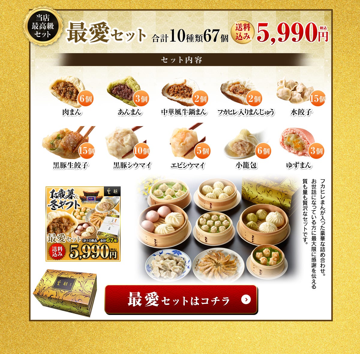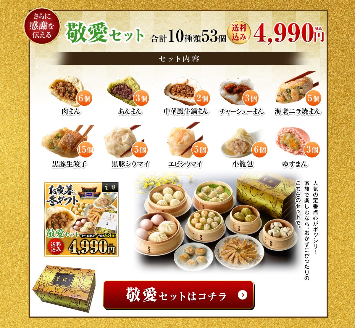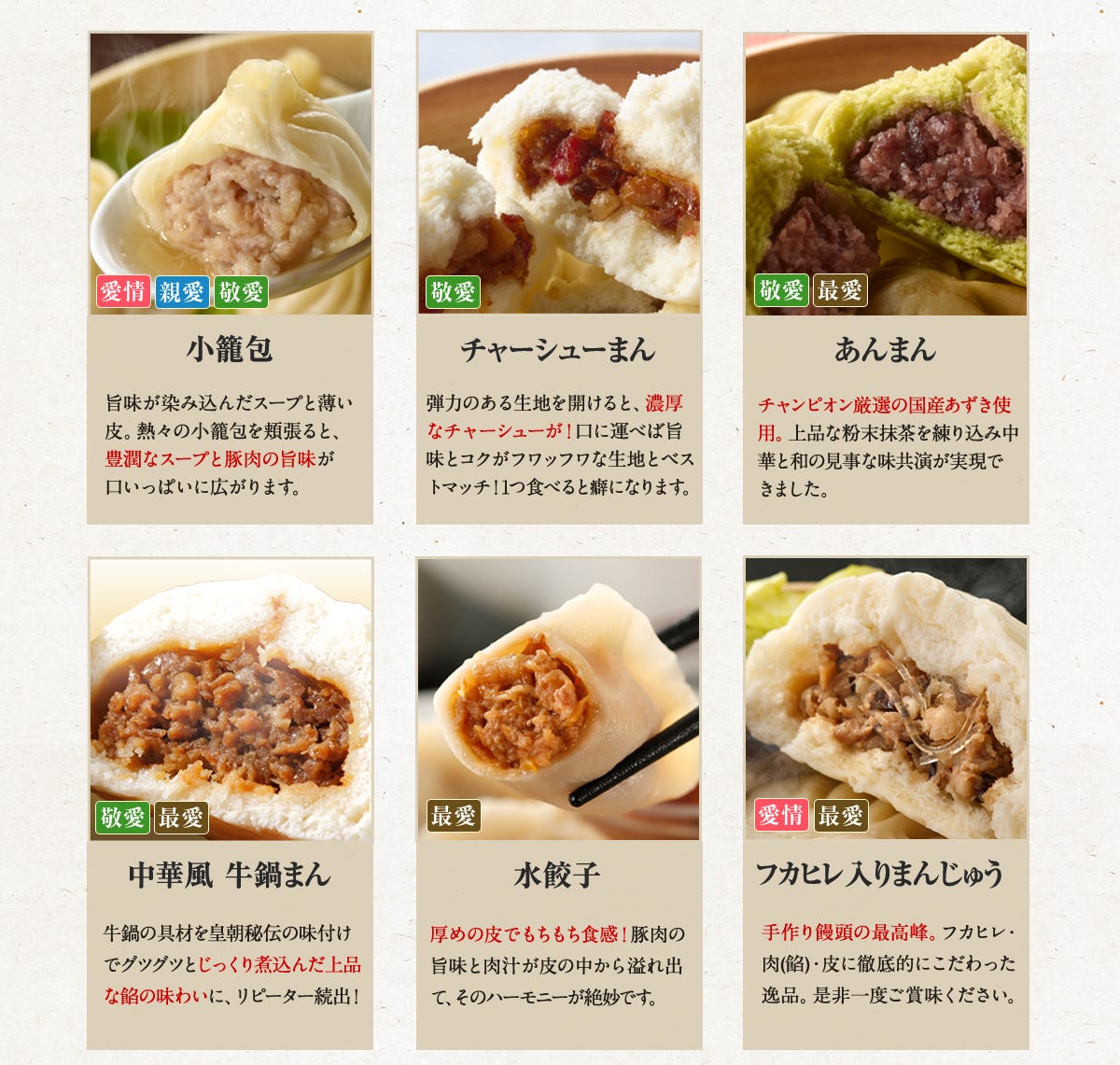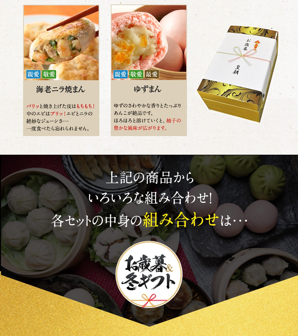 肉まん6個 / あんまん3個 / 中華風牛鍋まん2個 / フカヒレ入りまんじゅう2個 / 水餃子15個 / 黒豚生餃子15個 /黒豚シウマイ10個 / エビシウマイ5個 / 小籠包6個 / ゆずまん3個- ●原材料・アレルギー情報一覧はコチラ●
