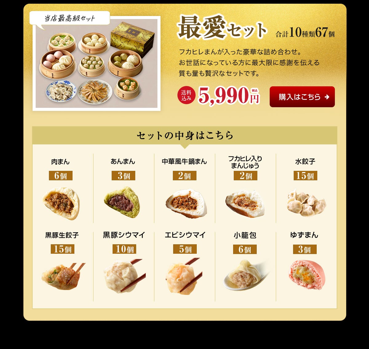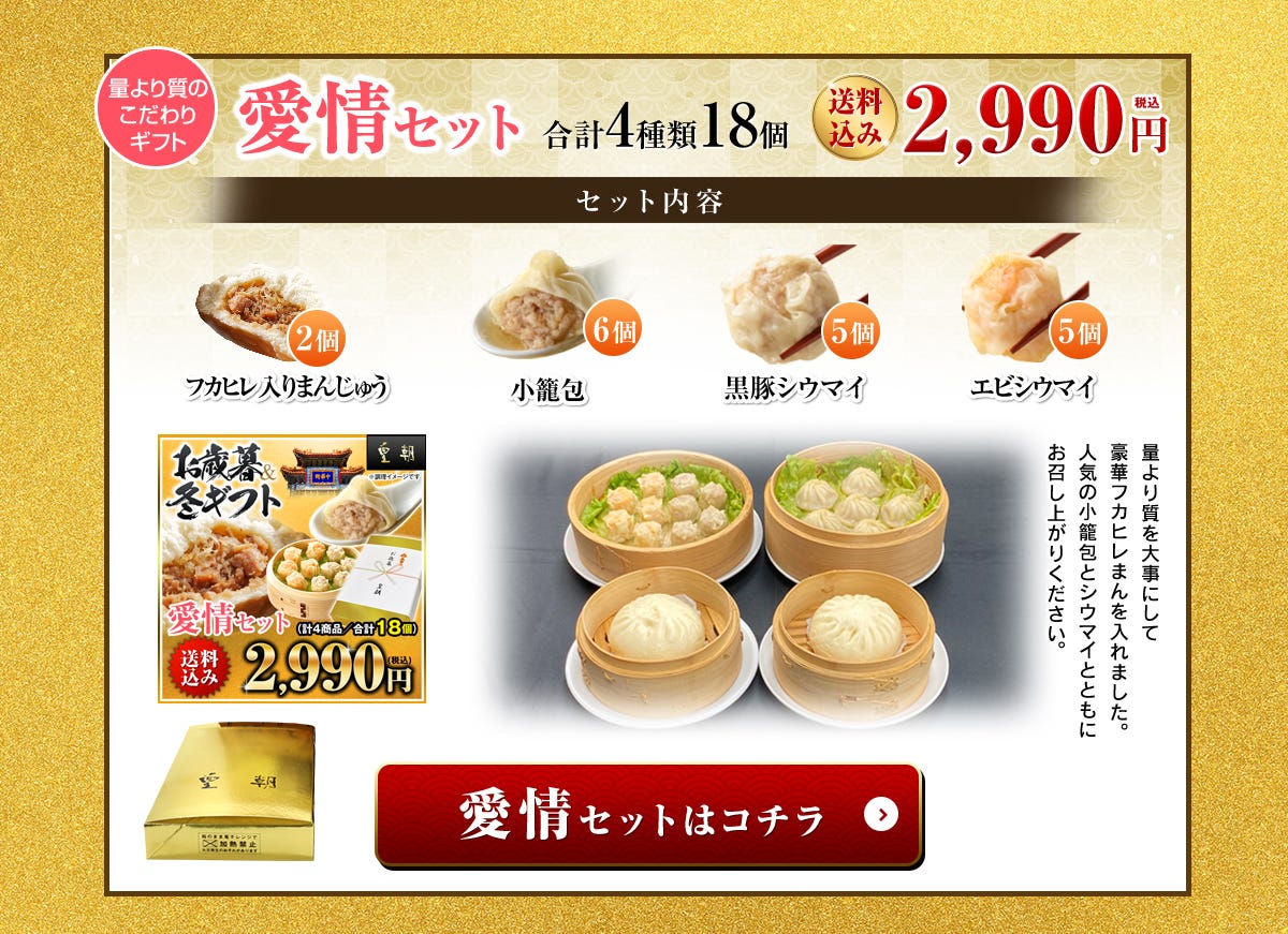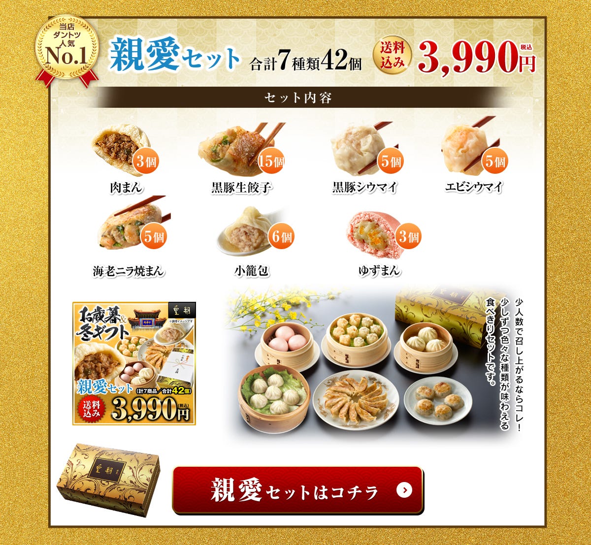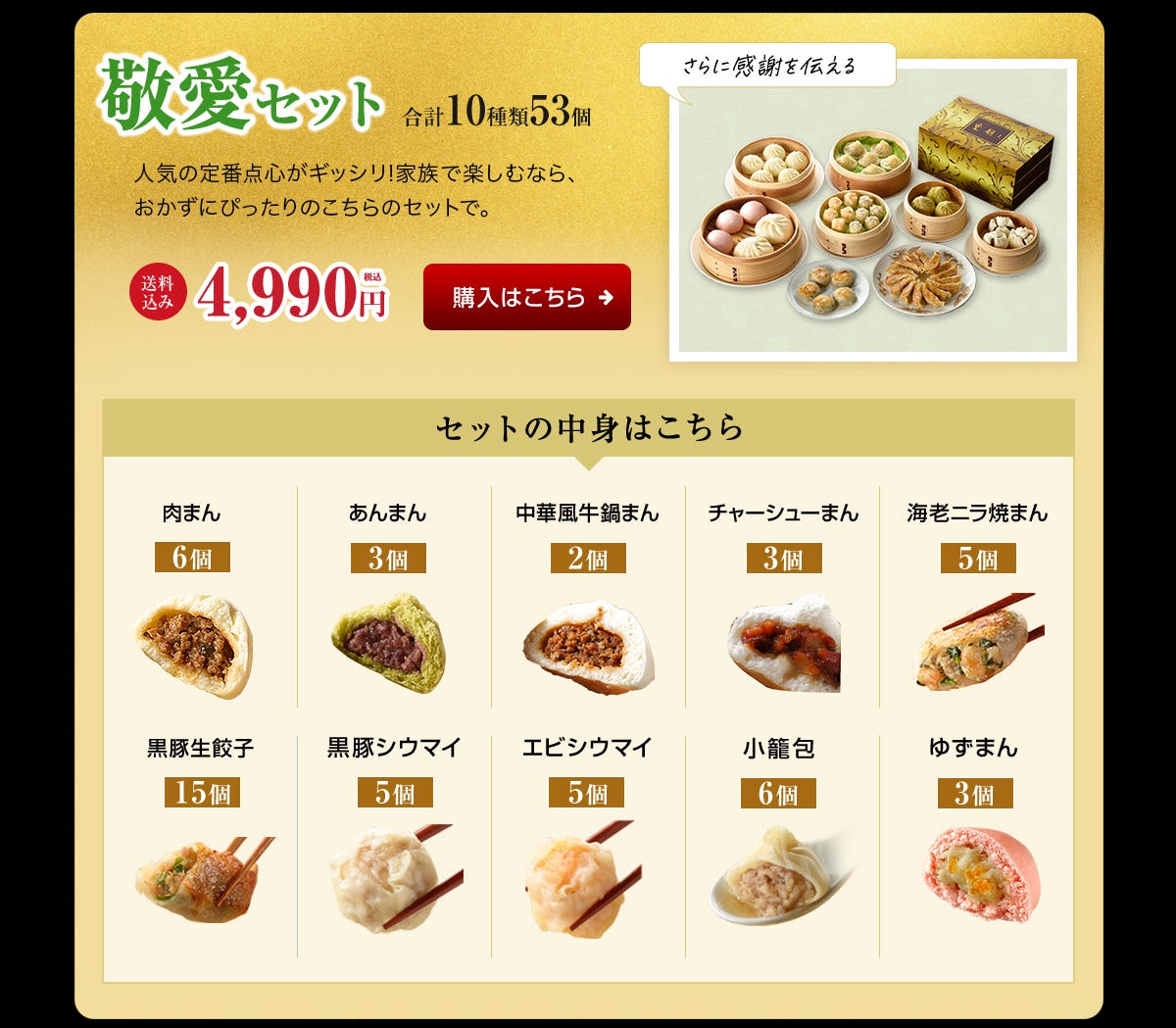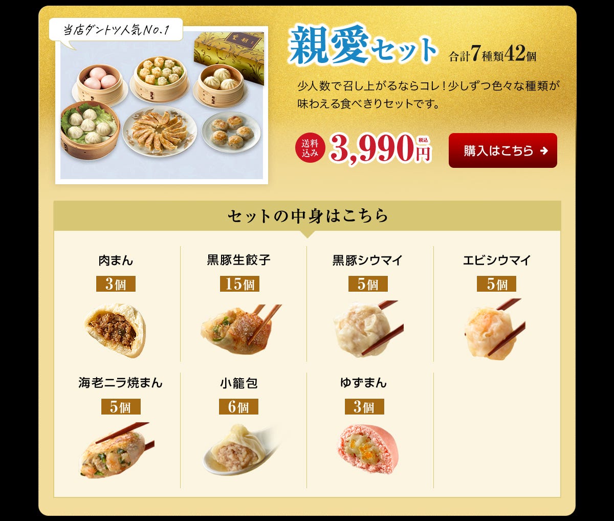 肉まん6個 / あんまん3個 / 中華風牛鍋まん2個 / フカヒレ入りまんじゅう2個 / 水餃子15個 / 黒豚生餃子15個 /黒豚シウマイ10個 / エビシウマイ5個 / 小籠包6個 / ゆずまん3個- ●原材料・アレルギー情報一覧はコチラ●
