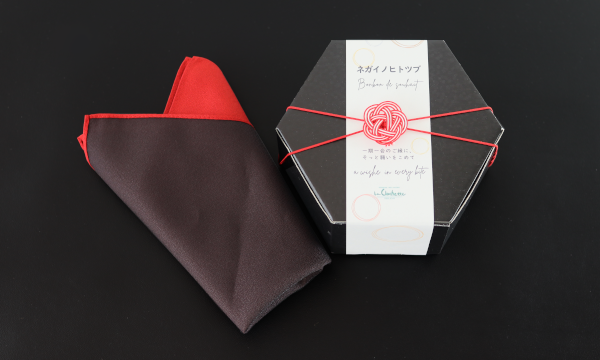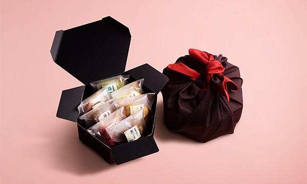 さらに、舞鶴の抹茶や焙じ茶、丹波の黒大豆きな粉、有田のみかん、京都のごま加工など、ご縁ある土地の素材を取り入れた全7種類の詰め合わせは、高級感漂う六角箱に梅結びの水引と風呂敷包みを施し、贈り物にも最適。