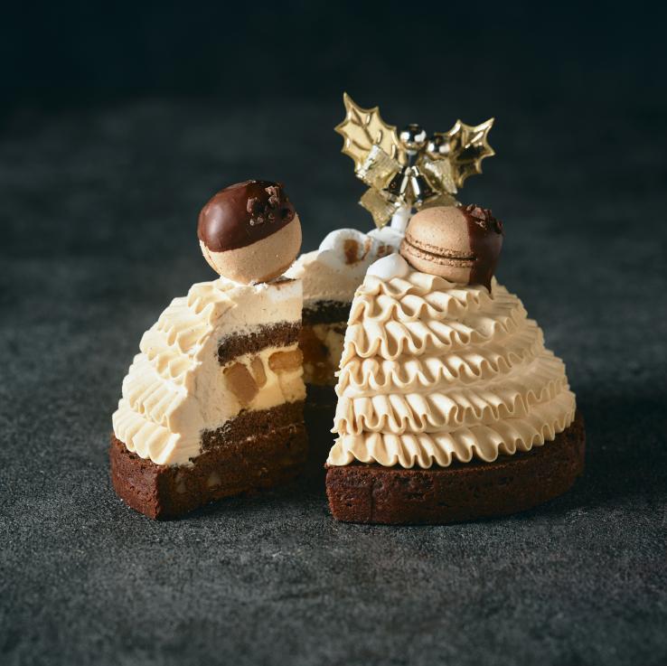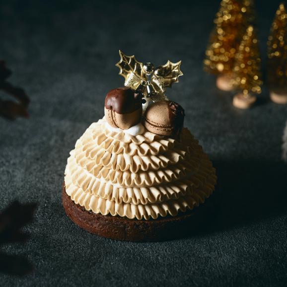 キャラメルムースを忍ばせました。土台のショコラタルトと合わせ表面はキャラメルクリームをフリル状に絞り、