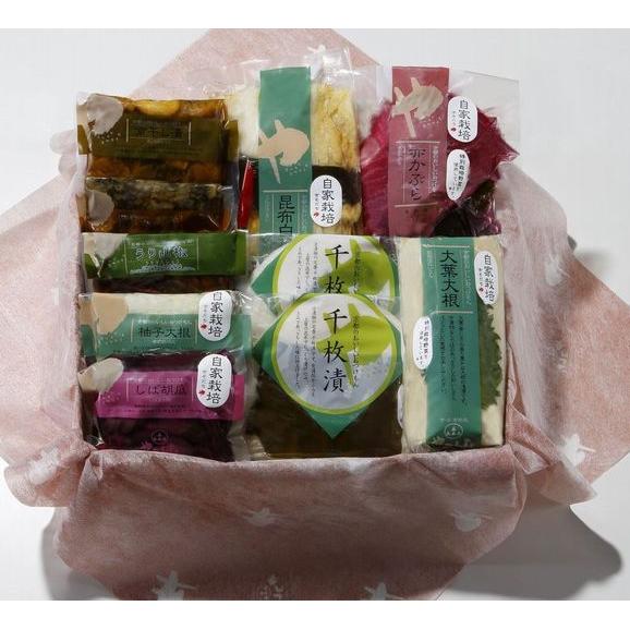 【内容】千枚漬(120g×2)、赤かぶ(200g)、大葉大根(1切)、昆布白菜(1/4切)、柚子大根(150g)、しば胡瓜(150g)、瓜山椒(150g)、刻みすぐき(150g)、京干漬(150g)
