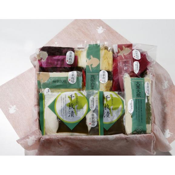 【内容】千枚漬(120g×2)、赤かぶ(200g)、大葉大根(1切)、昆布白菜(1/4切)、柚子大根(150g)、しば胡瓜(150g)