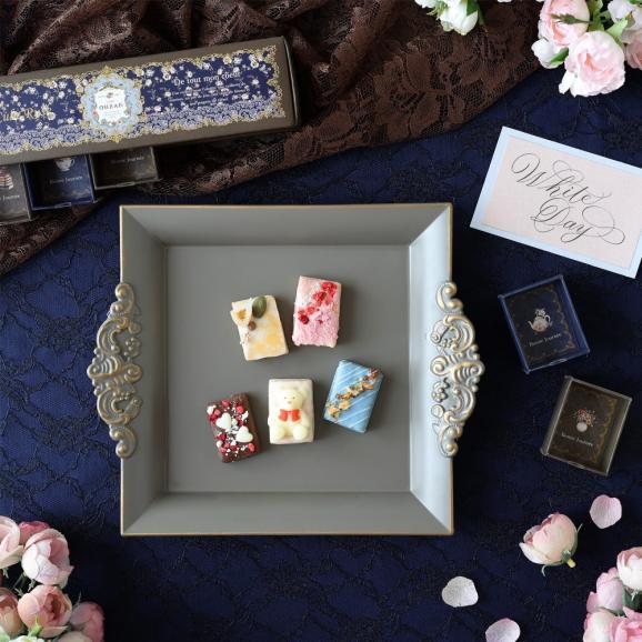 青色のチョコレートはホワイトチョコレートを色付けしたもの。優しくとける甘さの中に、ドライオレンジとローストアーモンドの香りがアクセントになっています。ミルクチョコレートには白いハートとラズベリー、赤い金平糖を合わせました。彩りのコントラストが際立つホワイトデーらしいデザインです。