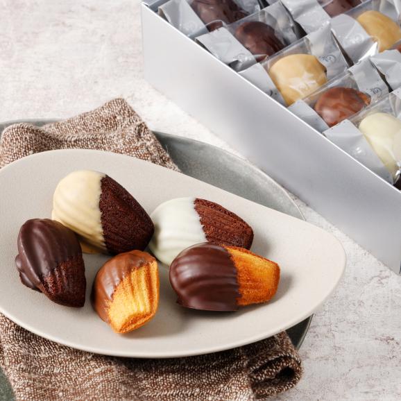 アーモンドの香ばしさが広がるプレーンとショコラ、2種のマドレーヌ生地に、産地や味わいの異なるチョコレートを丁寧にディップしました。ショコラティエのこだわりが詰まったチョコレートの個性を、一つの箱で贅沢に食べ比べいただけます。