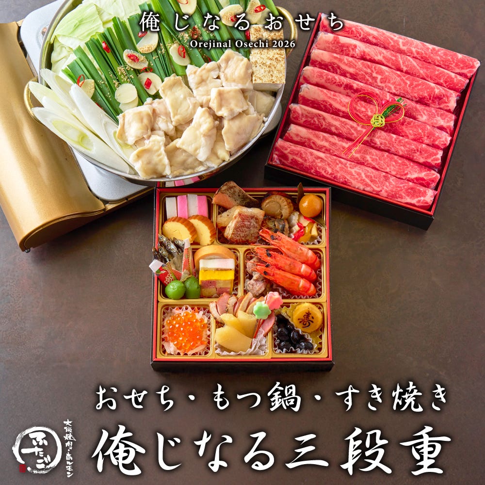 壱の重:俺じなるおせち、弐の重:黒毛和牛肩ローススライス400g、参の重:和牛もつ400g(国産牛小腸)とスープのもつ鍋セットの豪華三段重!