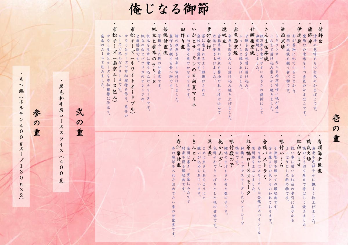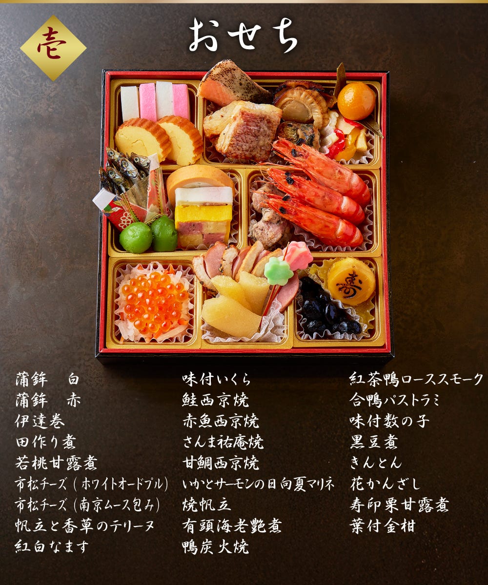 ・蒲鉾 白 ・蒲鉾 赤 ・伊達巻 ・田作り煮 ・若桃甘露煮 ・市松チーズ( ホワイトオードプル) ・市松チーズ(南京ムース包み) ・帆立と香草のテリーヌ ・紅白なます ・味付いくら ・鮭西京焼 ・赤魚西京焼 ・さんま祐庵焼 ・甘鯛西京焼 ・いかとサーモンの日向夏マリネ ・焼帆立 ・有頭海老艶煮 ・鴨炭火焼 ・紅茶鴨ローススモーク ・合鴨パストラミ ・味付数の子 ・黒豆煮 ・きんとん ・花かんざし ・寿印栗甘露煮 ・葉付金柑