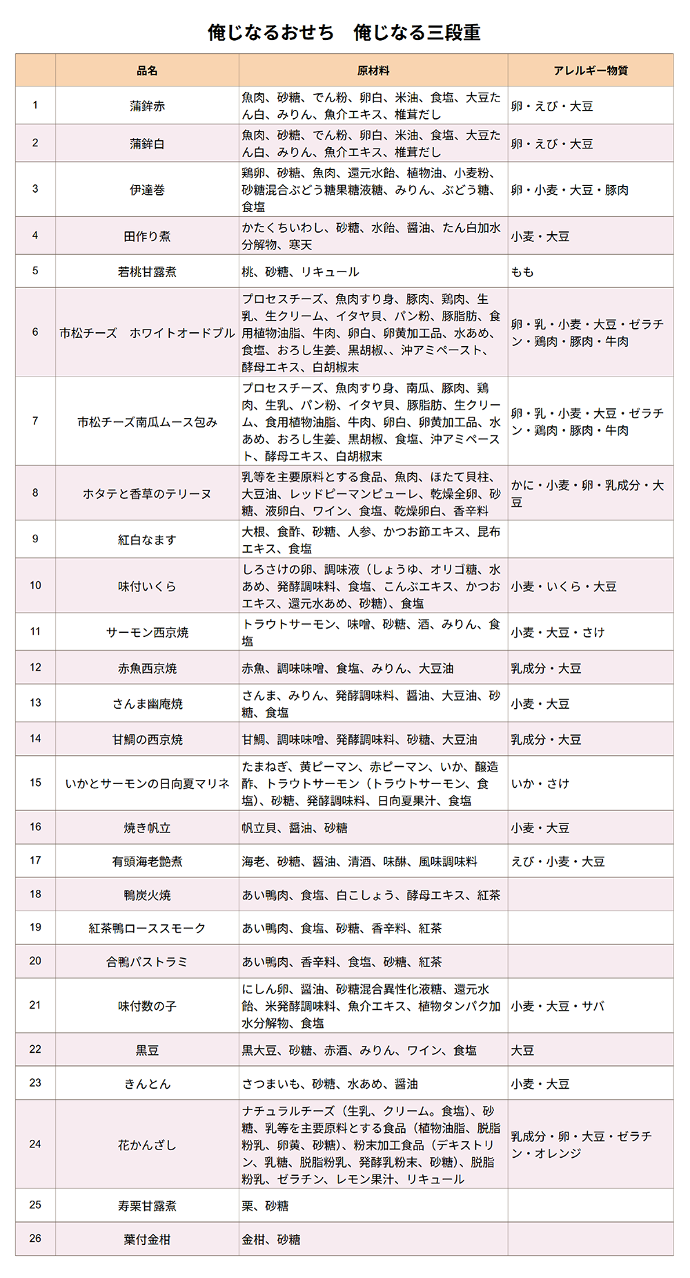 - えび、かに、小麦、卵、乳、いか、いくら、牛肉、ごま、さけ、さば、大豆、鶏肉、豚肉、もも、りんご、ゼラチン