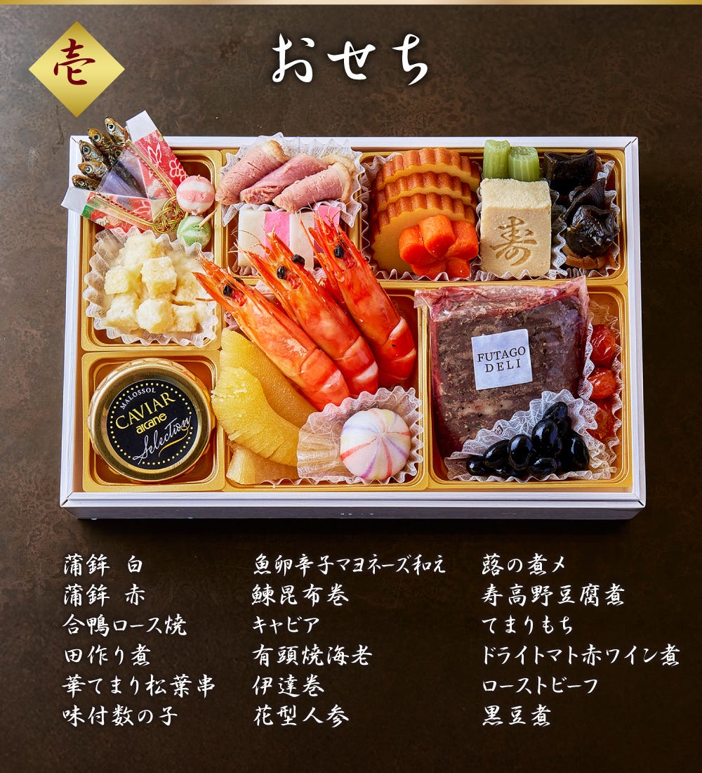 ・蒲鉾 白 ・蒲鉾 赤 ・合鴨ロース焼 ・田作り煮 ・華てまり松葉串 ・味付数の子 ・魚卵辛子マヨネーズ和え ・鰊昆布巻 ・キャビア ・有頭焼海老 ・伊達巻 ・花型人参 ・蕗の煮メ ・寿高野豆腐煮 ・てまりもち ・ドライトマト赤ワイン煮 ・ローストビーフ ・黒豆煮