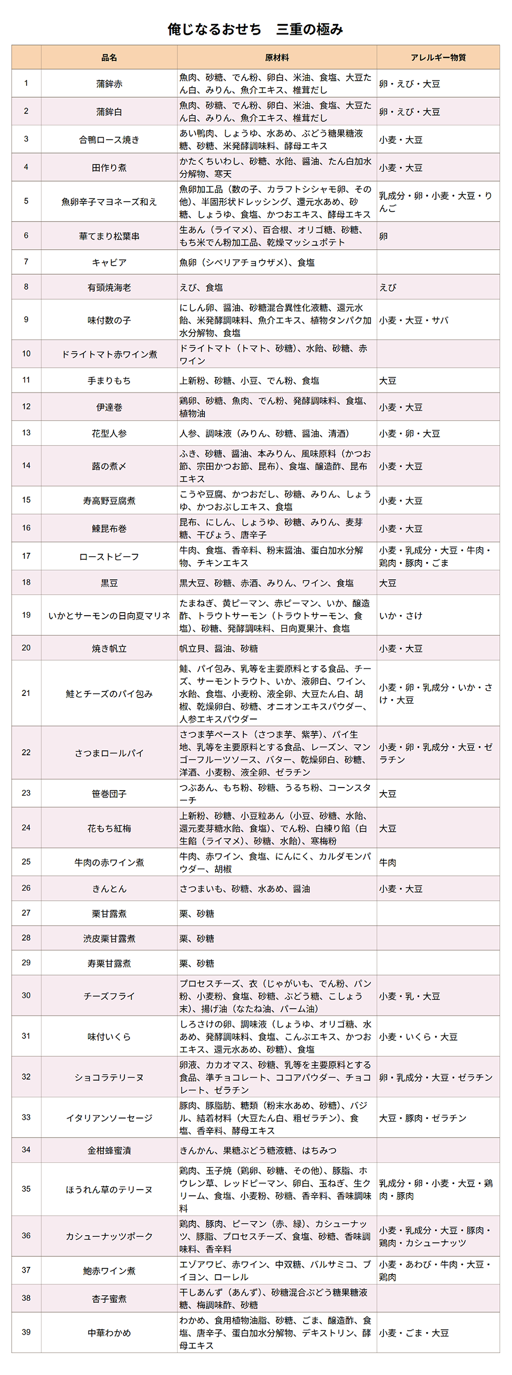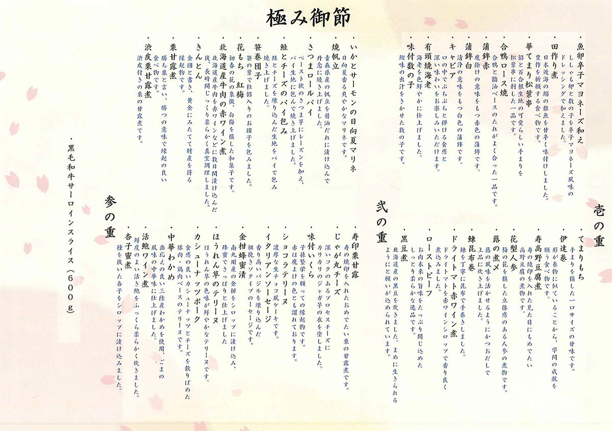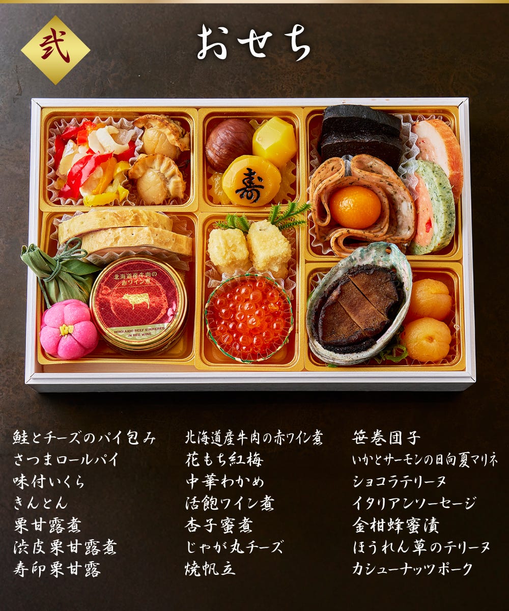 ・鮭とチーズのパイ包み ・さつまロールパイ ・味付いくら ・きんとん ・栗甘露煮 ・渋皮栗甘露煮 ・寿印栗甘露 ・北海道産牛肉の赤ワイン煮 ・花もち紅梅 ・中華わかめ ・活飽ワイン煮 ・杏子蜜煮 ・じゃが丸チーズ ・焼帆立 ・笹巻団子 ・いかとサーモンの日向夏マリネ ・ショコラテリーヌ ・イタリアンソーセージ ・金柑蜂蜜漬 ・ほうれん草のテリーヌ ・カシューナッツポーク