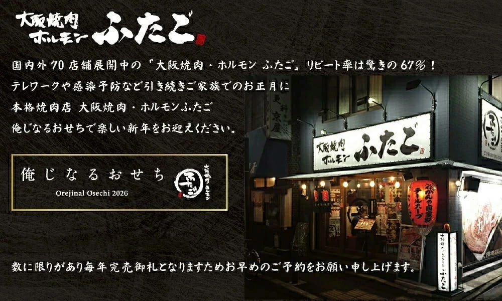 壱の重:俺じなるおせち 弐の重:俺じなるおせち 参の重:黒毛和牛サーロインスライス(600g) ご家庭で大阪焼肉・ホルモンふたごの自慢の肉おせちをお楽しみください!