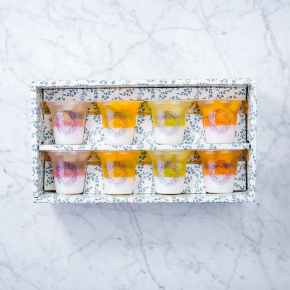 神奈川・葉山の海辺にあるパティスリーラ・マーレ・ド・チャヤが贈るゼリーの詰合せです。贅沢な果実、濃厚なピューレ、そして香り豊かな杏仁風味ゼリーの3つの味わいが1つで楽しめます。アルコール不使用のため、小さなお子様でも安心してお召し上がりいただけます。白桃、黄桃、洋梨、マンゴーの4種入です。