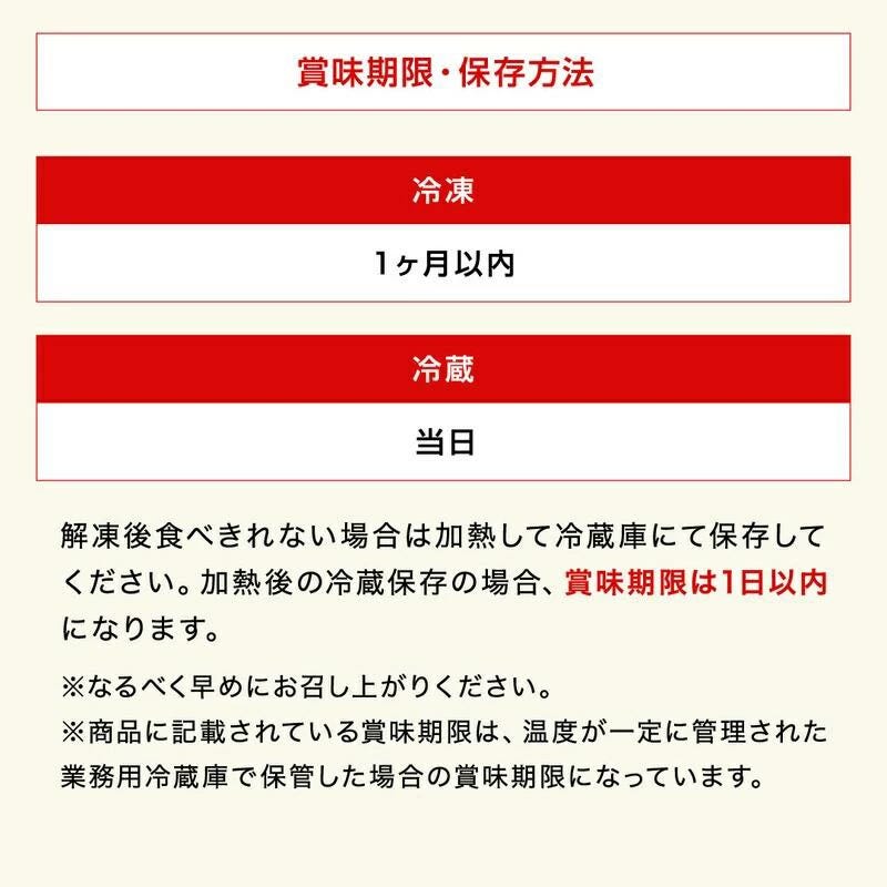 ※家庭用冷凍庫の場合、業務用冷凍庫より温度が高いので品質が損なわれる為、お早めにお召し上がり下さいませ。