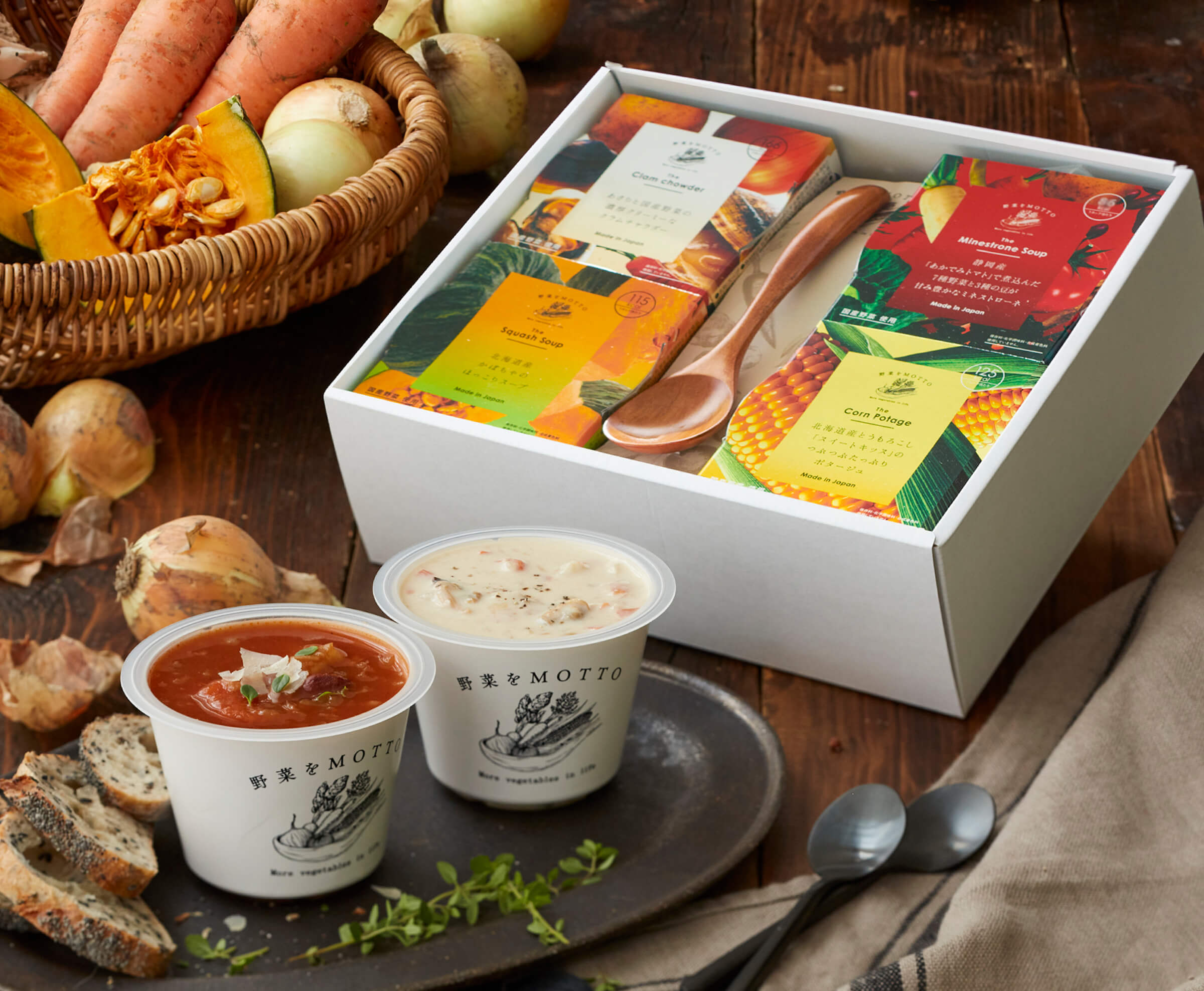野菜の栄養いっぱいのレンジカップスープセットを思いやりとともに。