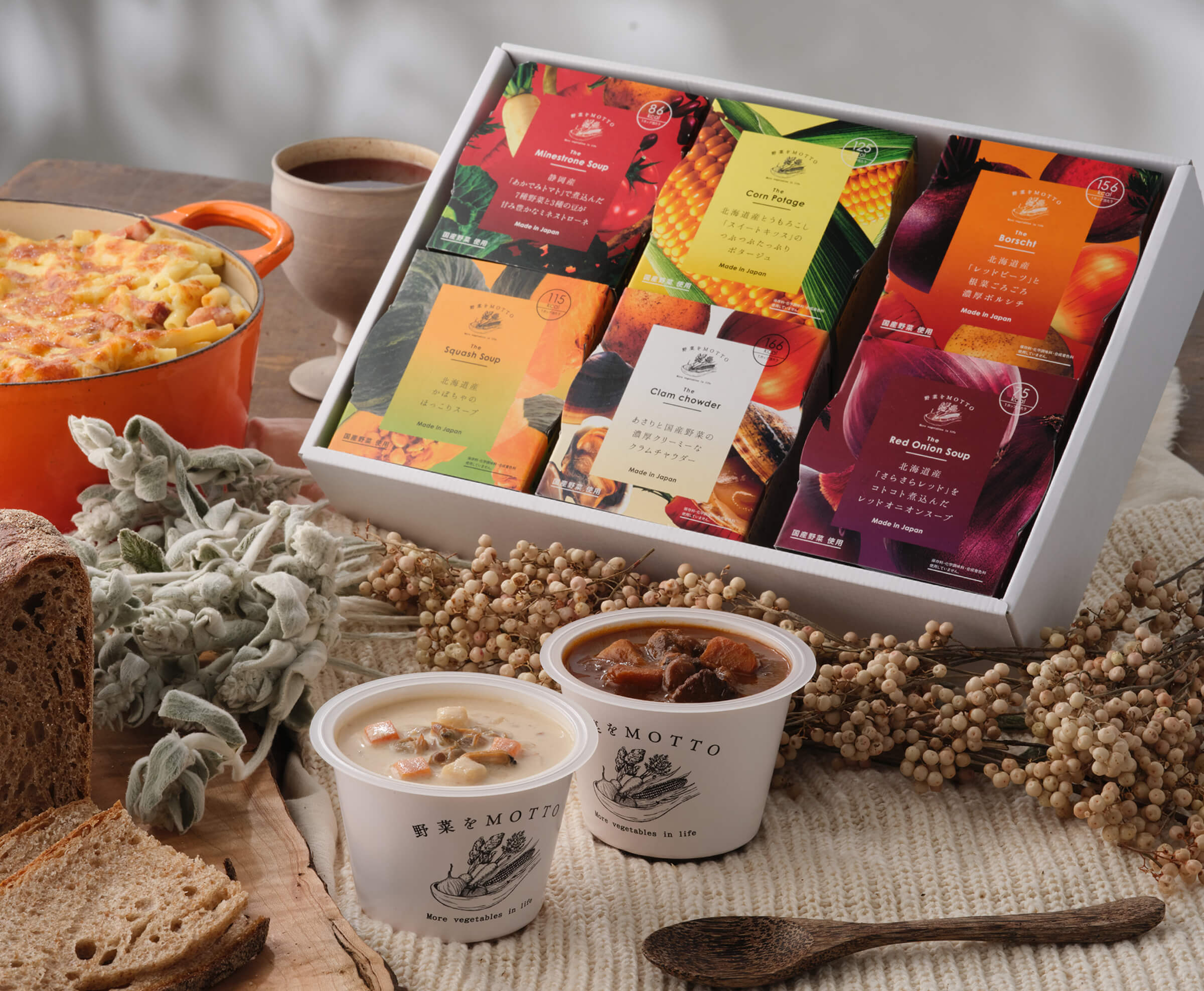 野菜の栄養いっぱいのレンジカップスープセットを思いやりとともに。