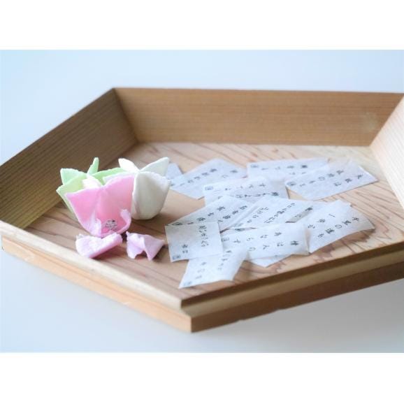 加賀金沢の新春の風物詩「つじうら」は、小さな「おみくじ」を最中種で包んだ縁起菓子。皮を二つに割って、こぼれ出る新年の運だめしをお楽しみください。