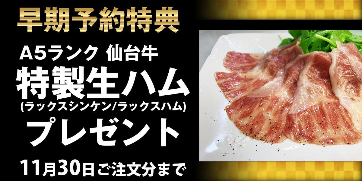 <早期特典 11月30日まで>【仙台牛生ハム】 牛肉(仙台牛)、塩、ぶどう糖、水飴/甘味料(ソルビット)、リン酸塩(Na,K)、発色剤(硝酸K、亜硝酸Na)、酸化防止剤(V,C) -->