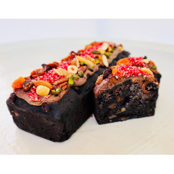 カカオマス、バター、生クリーム、卵、ココアパウダー、ラカントパウダー、米粉、コーンスターチ、トレハロース、レーズン、杏、イチジク、アーモンド、クルミ、ピスタチオ、ヘーゼルナッツ、ラズベリーパウダー