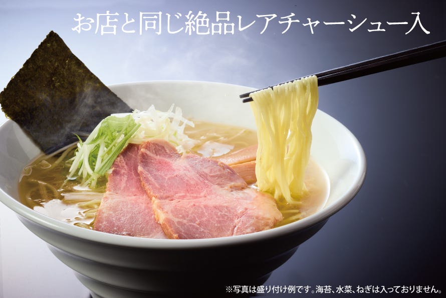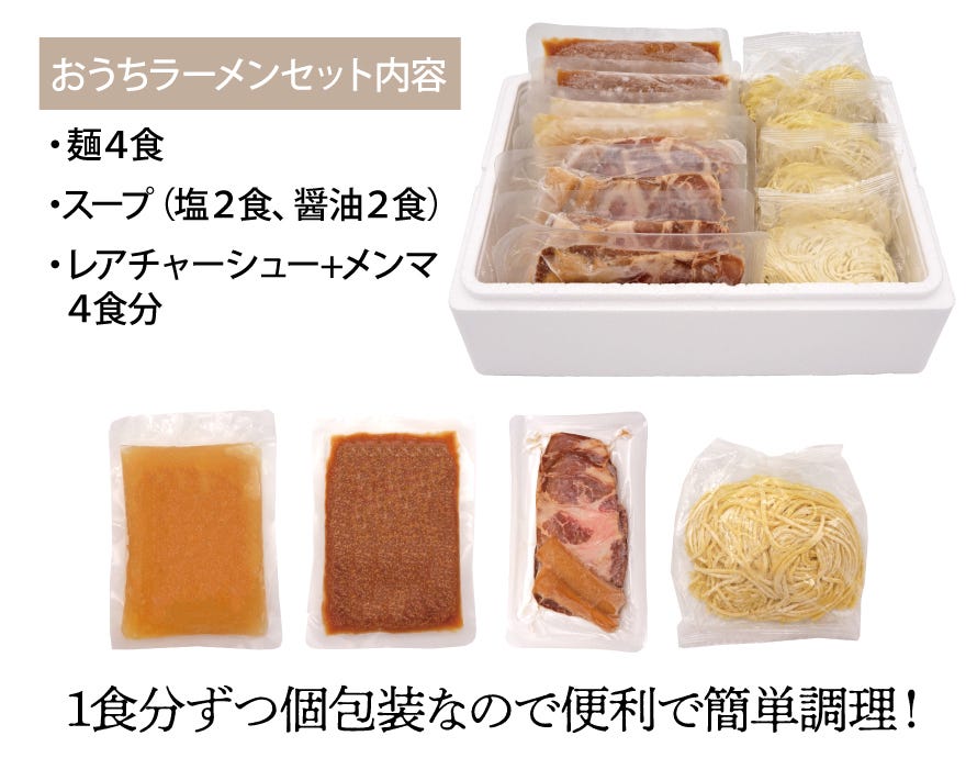 - 麺4食 スープ 塩2食、醤油2食 レアチャーシュー4食分 メンマ4食分