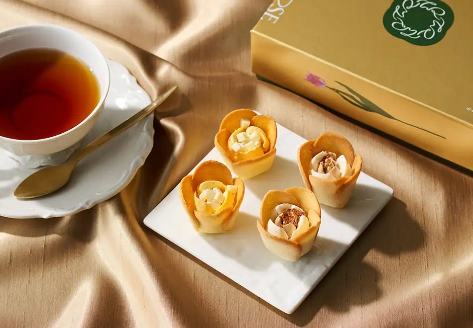 【チューリップローズ チーズ】準チョコレート(国内製造)、加工油脂(精製加工油脂、植物油脂、バター、脱脂粉乳)、液卵白(卵を含む)、砂糖、小麦粉、チーズパウダー、バター、パイ(小麦粉、加工油脂、でん粉、その他)、バターミルクパウダー、粉糖、乳等を主要原料とする食品、油脂加工品、精製加工油脂、食塩、酒粕パウダー/セルロース、乳化剤(大豆由来)、香料、酸化防止剤(V.E、V.C)、カロテノイド色素、pH調整剤、増粘剤(カラギナン)