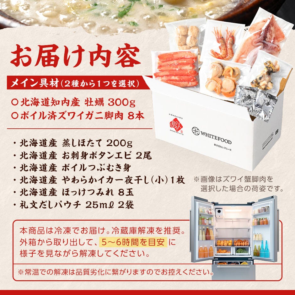 【鍋セット内容】 ● メイン具材(ズワイガニ・牡蠣から1種選択)