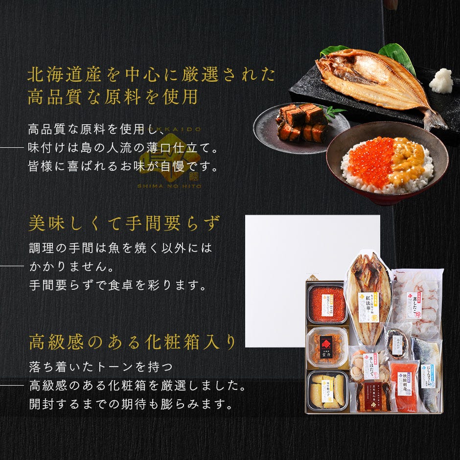 数々の賞を受賞した北海道の海鮮ギフト専門店 島の人から、特別な1日に華を添える海鮮9点入りのギフトセットをご紹介いたします。