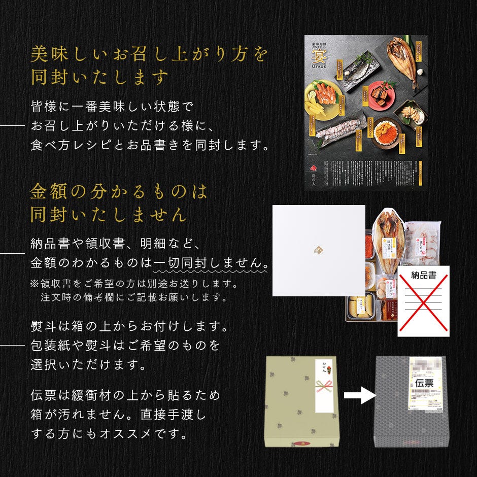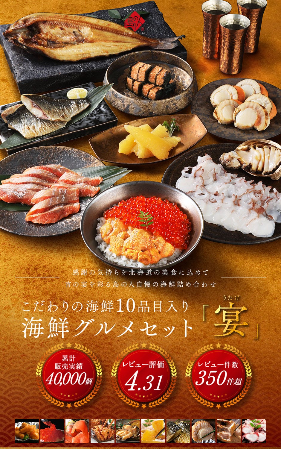 ご家庭でも高級料亭のような贅沢な体験をお楽しみいただきたいと、島の人が想いを込めた「宴」。北海道らしいウニやいくらなど海鮮9品目をお届け。海鮮ギフトで大切なひとときを、より華やかに彩ります。