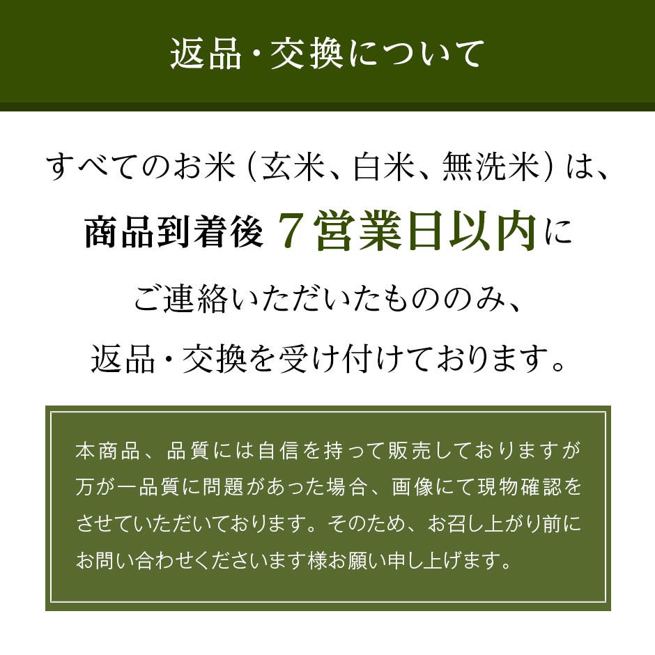 ●すべてのお米(玄米、白米、無洗米)はお客様へ商品が到着後、7営業日以内にご連絡いただいたもののみ返品・交換を受け付けております。