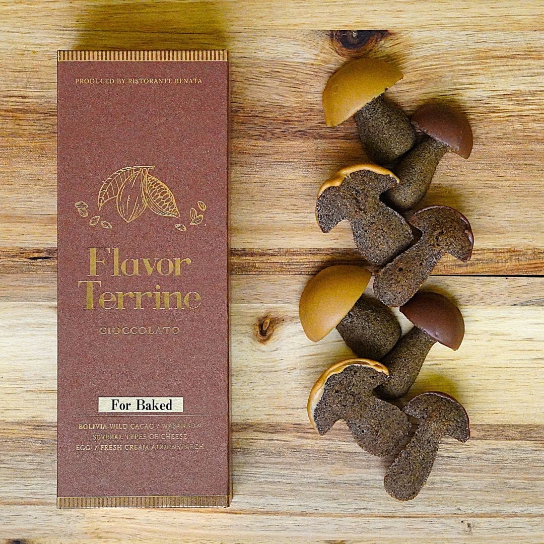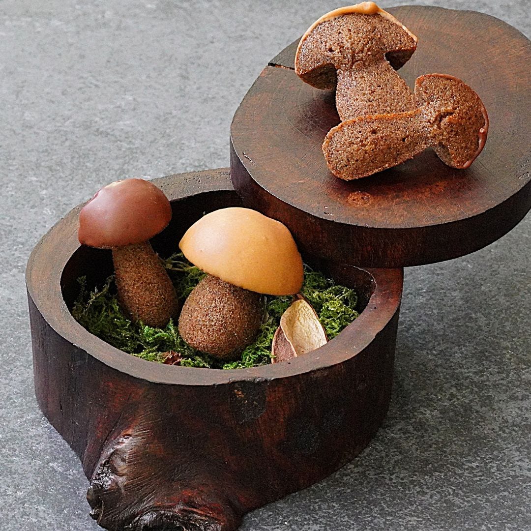 フィナンシエ生地にはイタリア産ポルチーニを使ったパウダーを混ぜ込み、塩で味を引き締め、かさの部分はポルチーニの色に似せた2種類のチョコレートでコーティングしています。